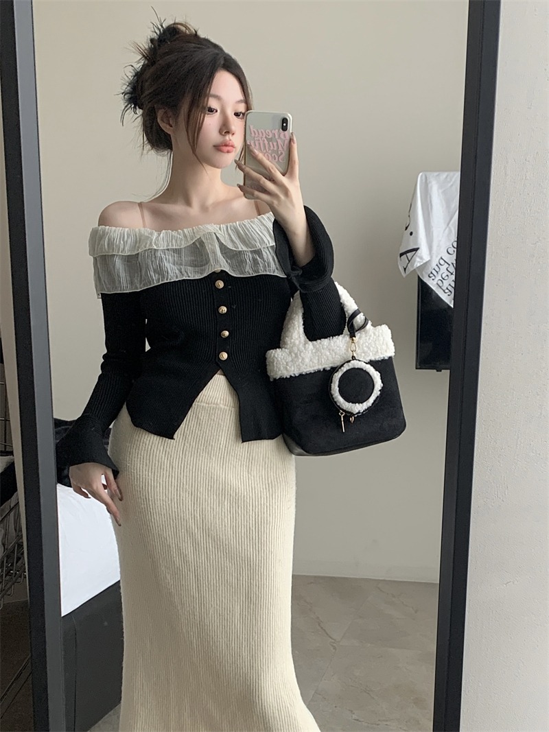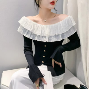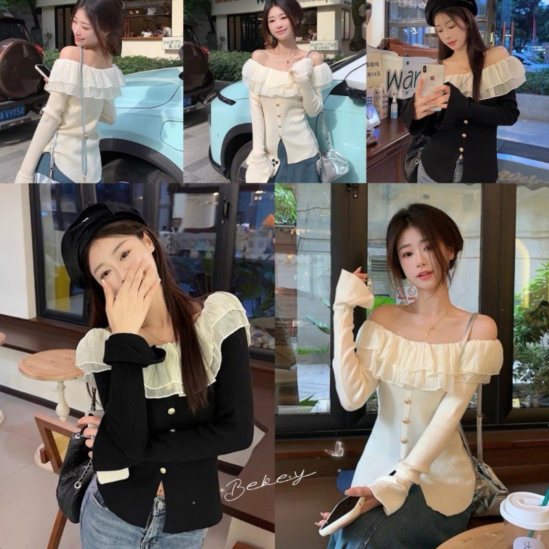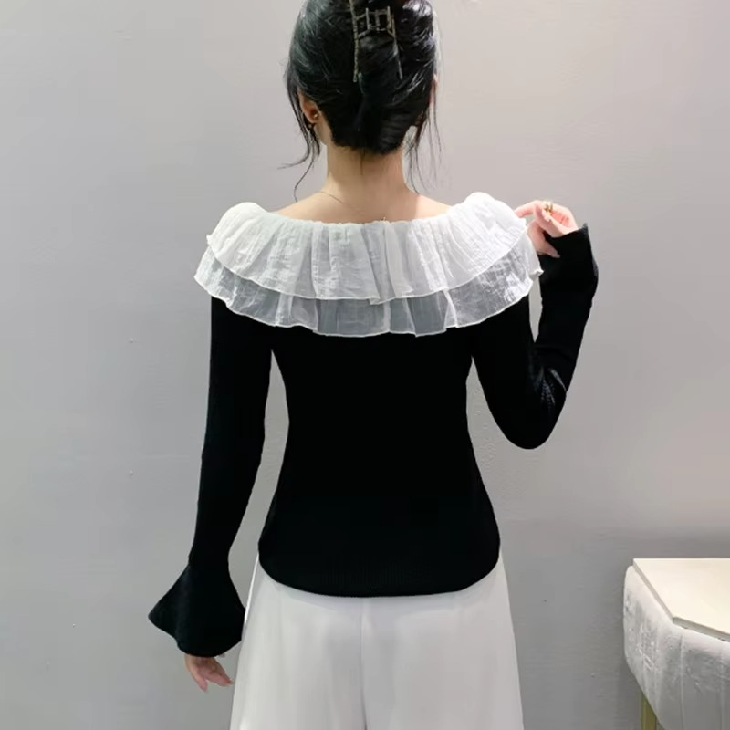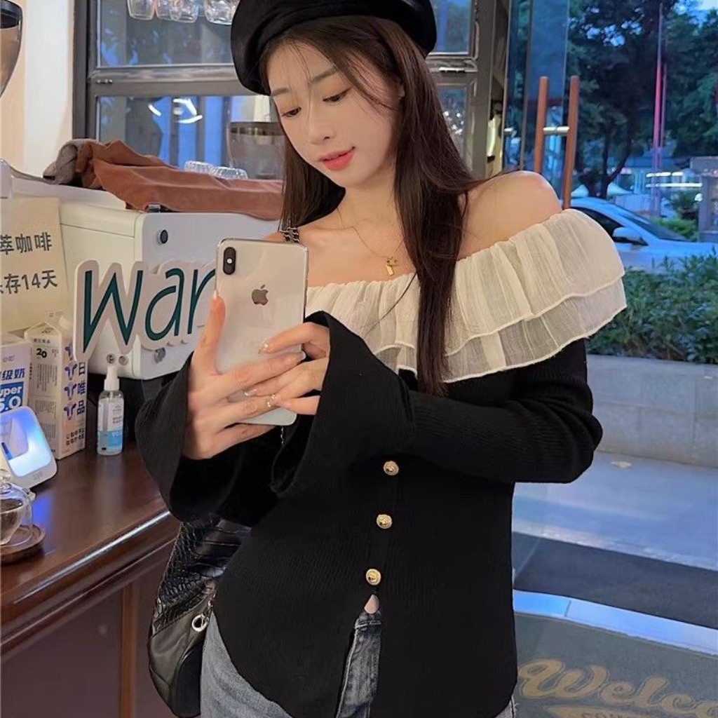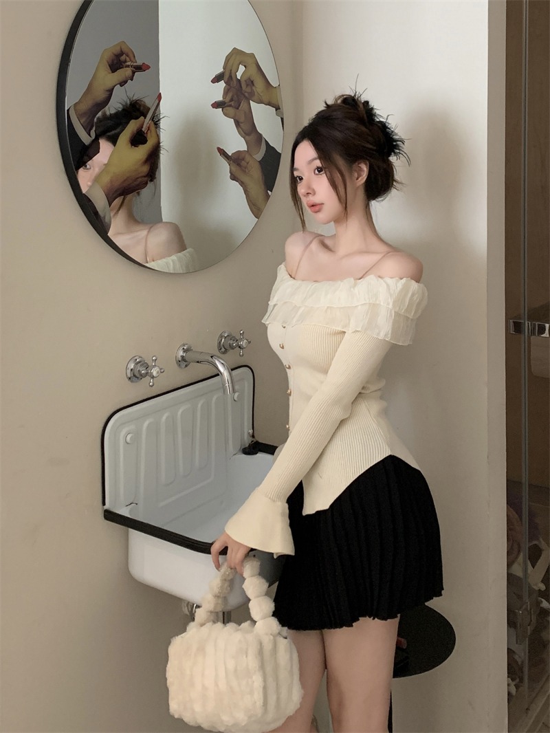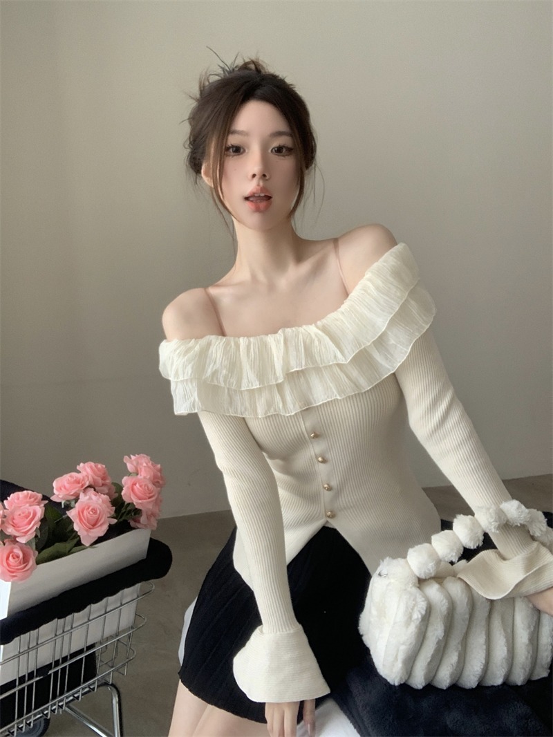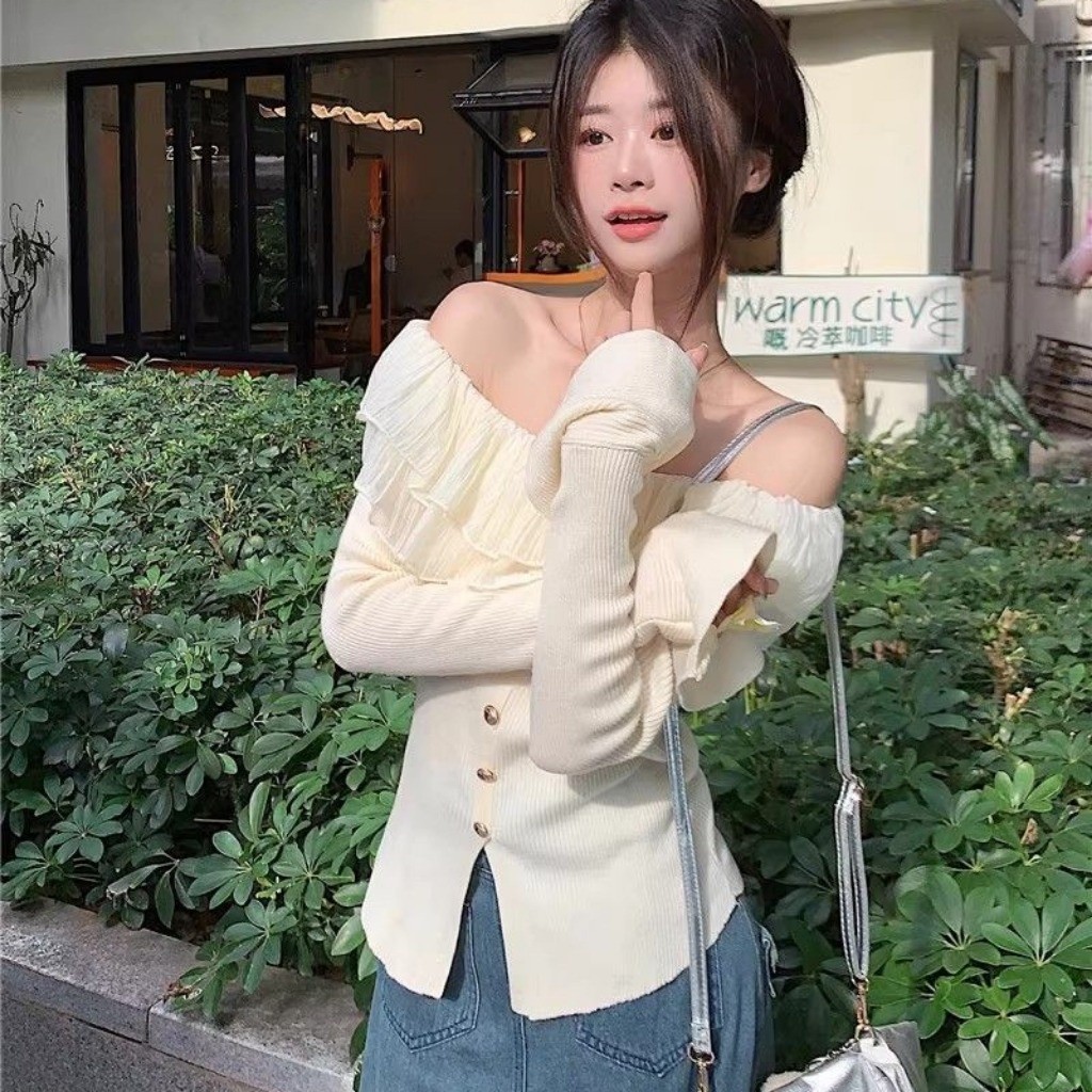 Korean pure desire Elegant off-shoulder knit top with flared sleeves and delicate ruffles.
